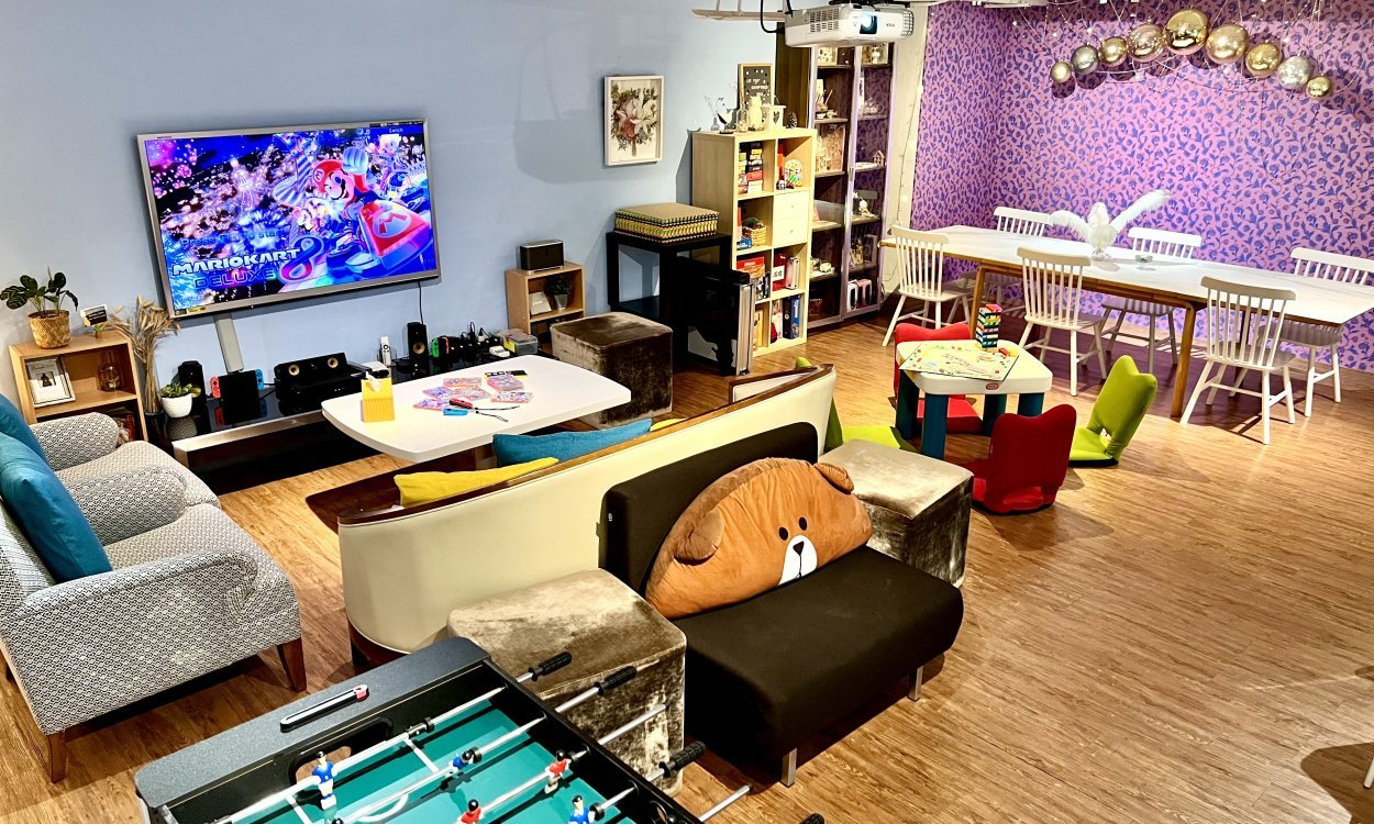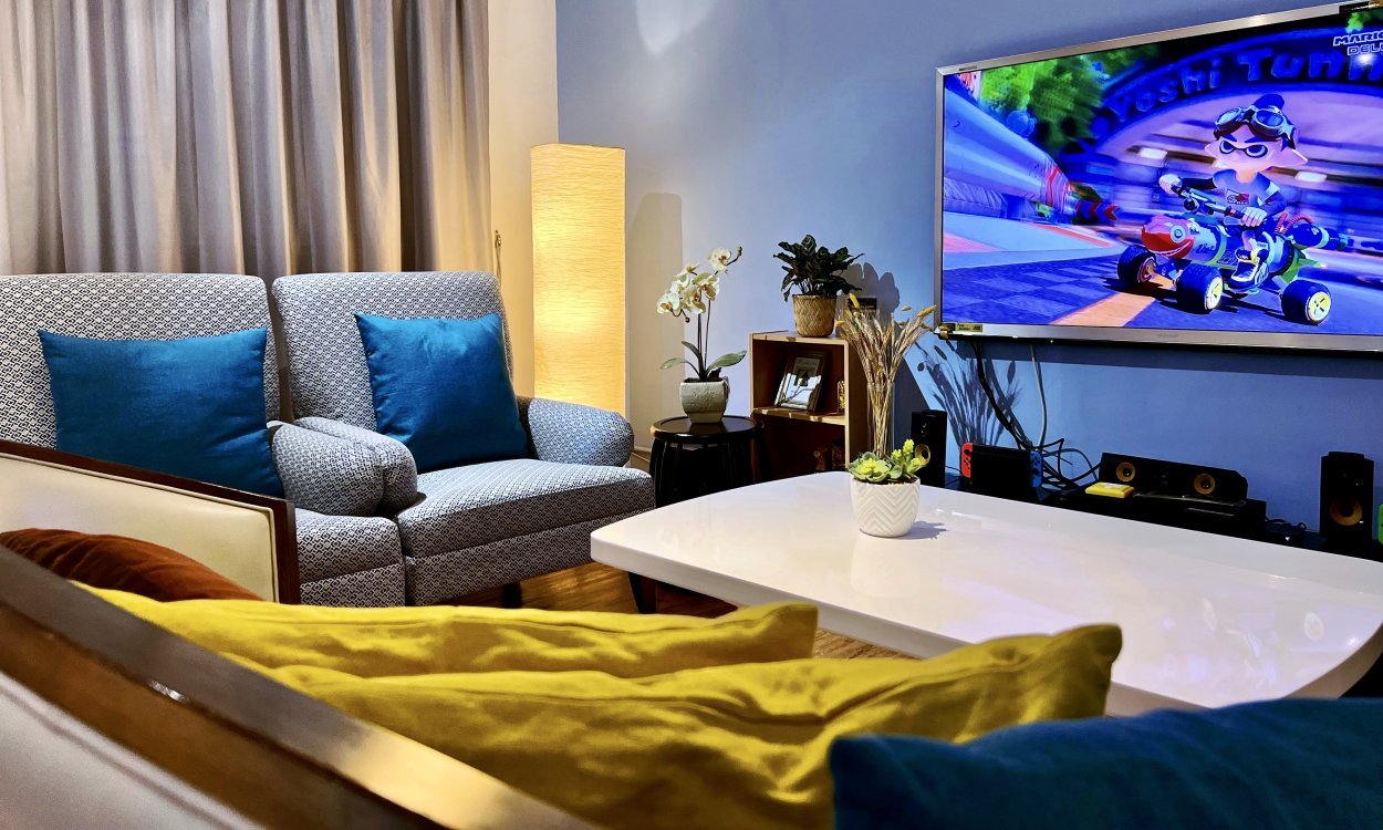 The 9-ft long wooden table, large leather couch and fluffy rug…imagine the homey, cozy ambience when you step into our 1000 sq.ft. home-decorated sitting room! Equipped with entertainment amenities like boardgames, karaoke, Nintendo Switch, Apple TV, 60” 4K TV and 5.1 home theatre system, Auxano House is surely an ideal place for parties from 12 to 40 pax! What’s more, we provide all our guests complimentary free flow of beverage like soft drinks, juice, coffee and tea during party time!